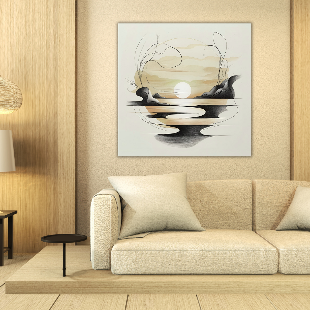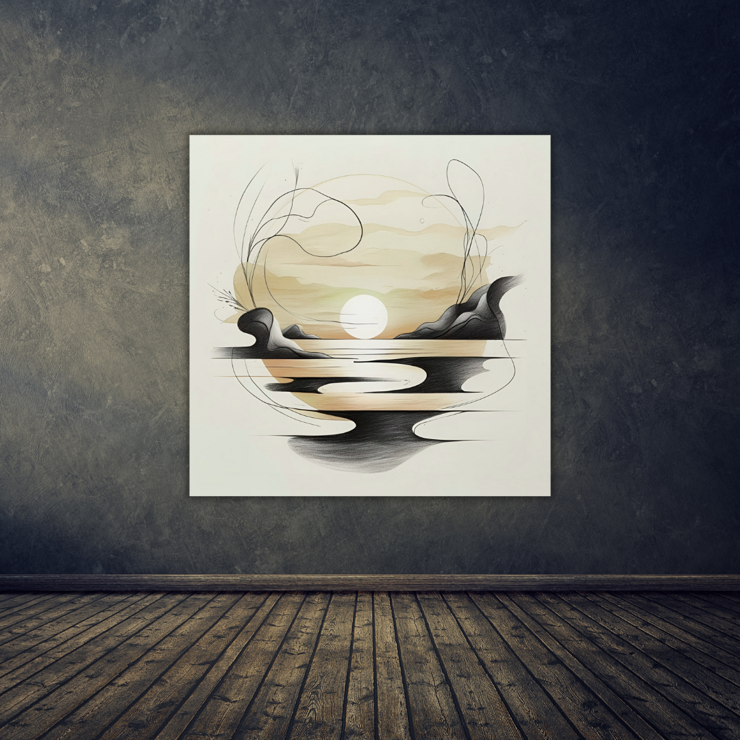 „Saulės kelias“ – tai subtilus abstraktus paveikslas, kuriame šviesos ir šešėlių žaismas susilieja su ramiai tekančiu horizontu. Šiltų auksinių tonų saulė įkvepia ramybės, o juodų formų kontrastai kuria gilų ir modernų vizualinį efektą.