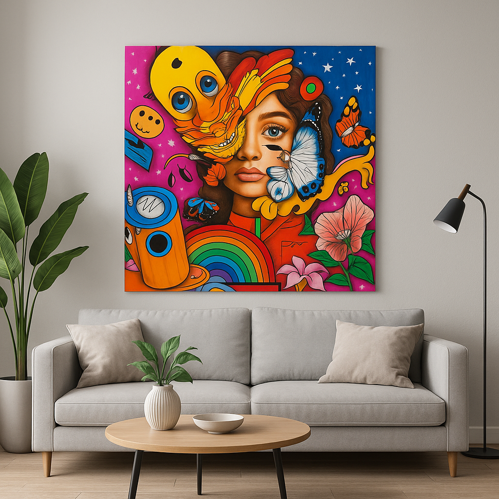 „Įkvėpimo sprogimas“ – tai ryškus ir ekspresyvus kūrinys, kuriame susilieja vidinis pasaulis, emocijos ir vaizduotė. Kiekvienas simbolis – tai kūrybos blyksnis, o spalvos kviečia žiūrovą pasinerti į fantazijos sūkurį.