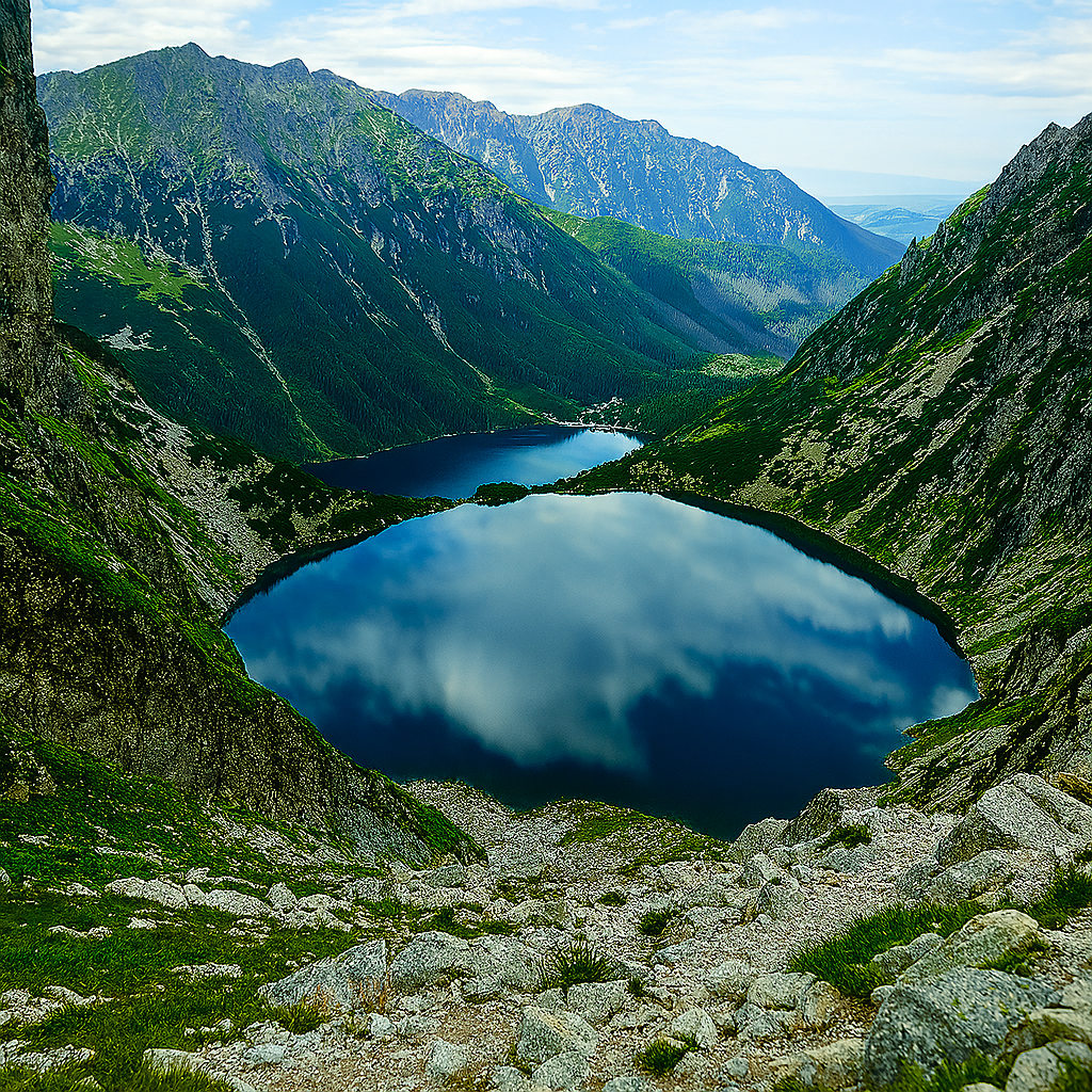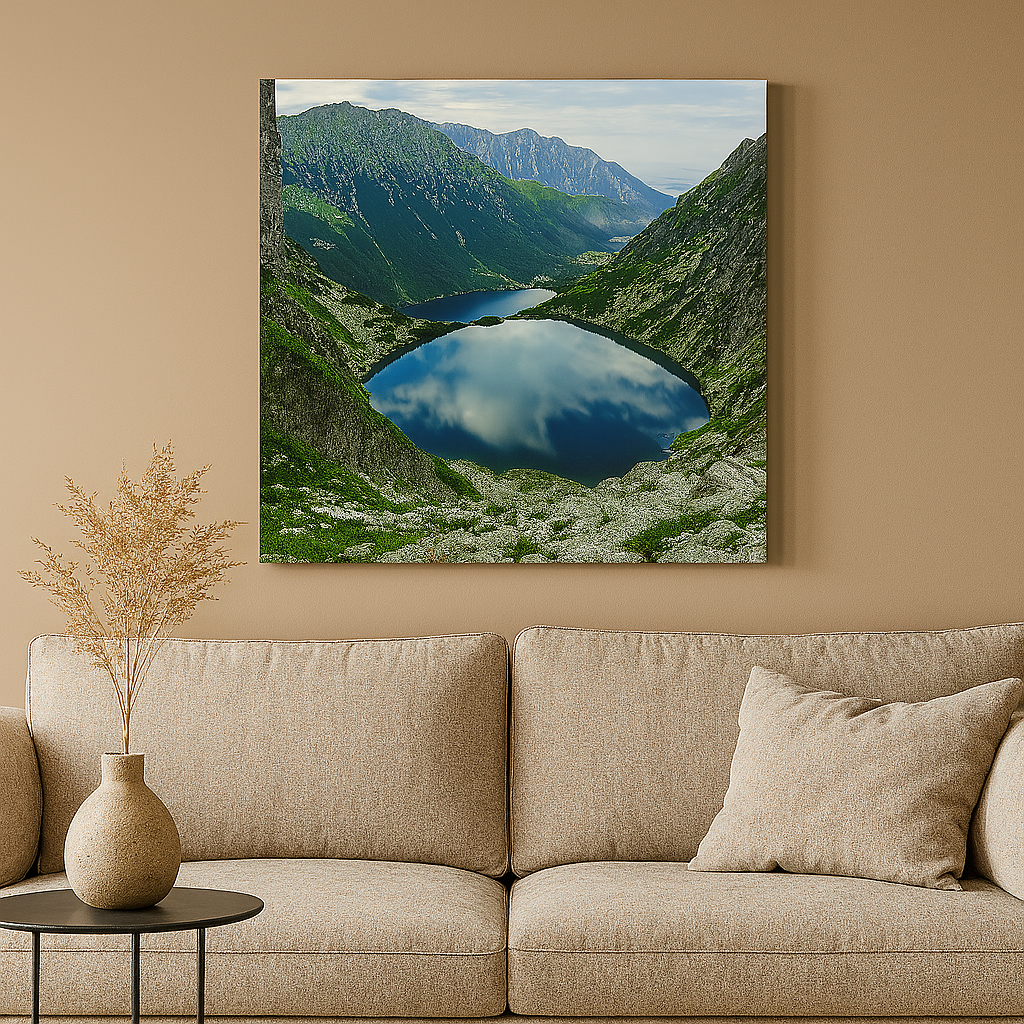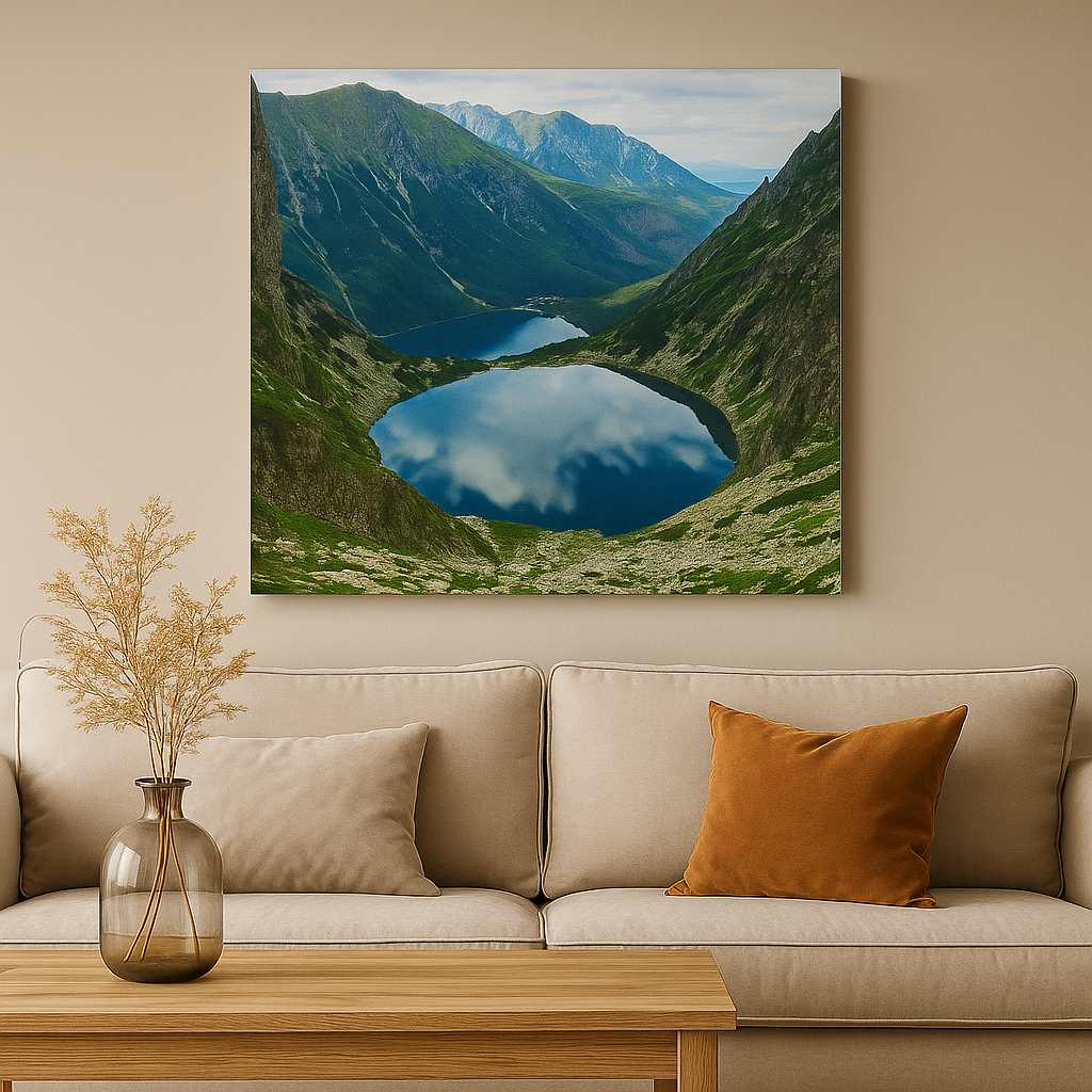 „Kalnų tyluma“ – tai paveikslas, kuriame sustingusi akimirka alsuoja ramybe. Morsko Oko ežeras, stovi tarp stačių Tatrų kalnų, tyliai atspindi dangų, tarsi gamtos siela žiūri į save. Švelnios spalvos, veidrodinis vandens paviršius ir didinga kalnų galia būtų sukurtas pojūtis, lyg toli nuo pasaulio šurmulio – ten, kur karaliauja tyla, grynas oras ir amžinas gamtos didingumas.