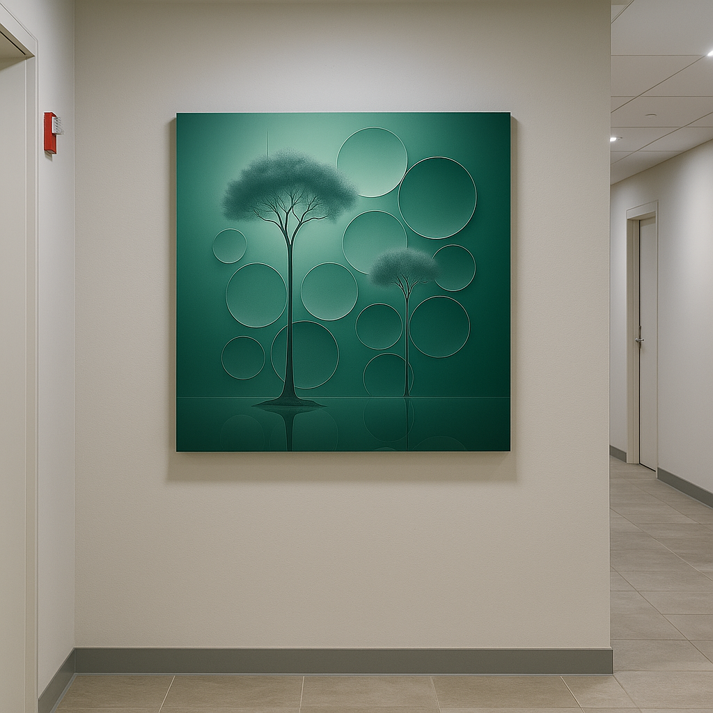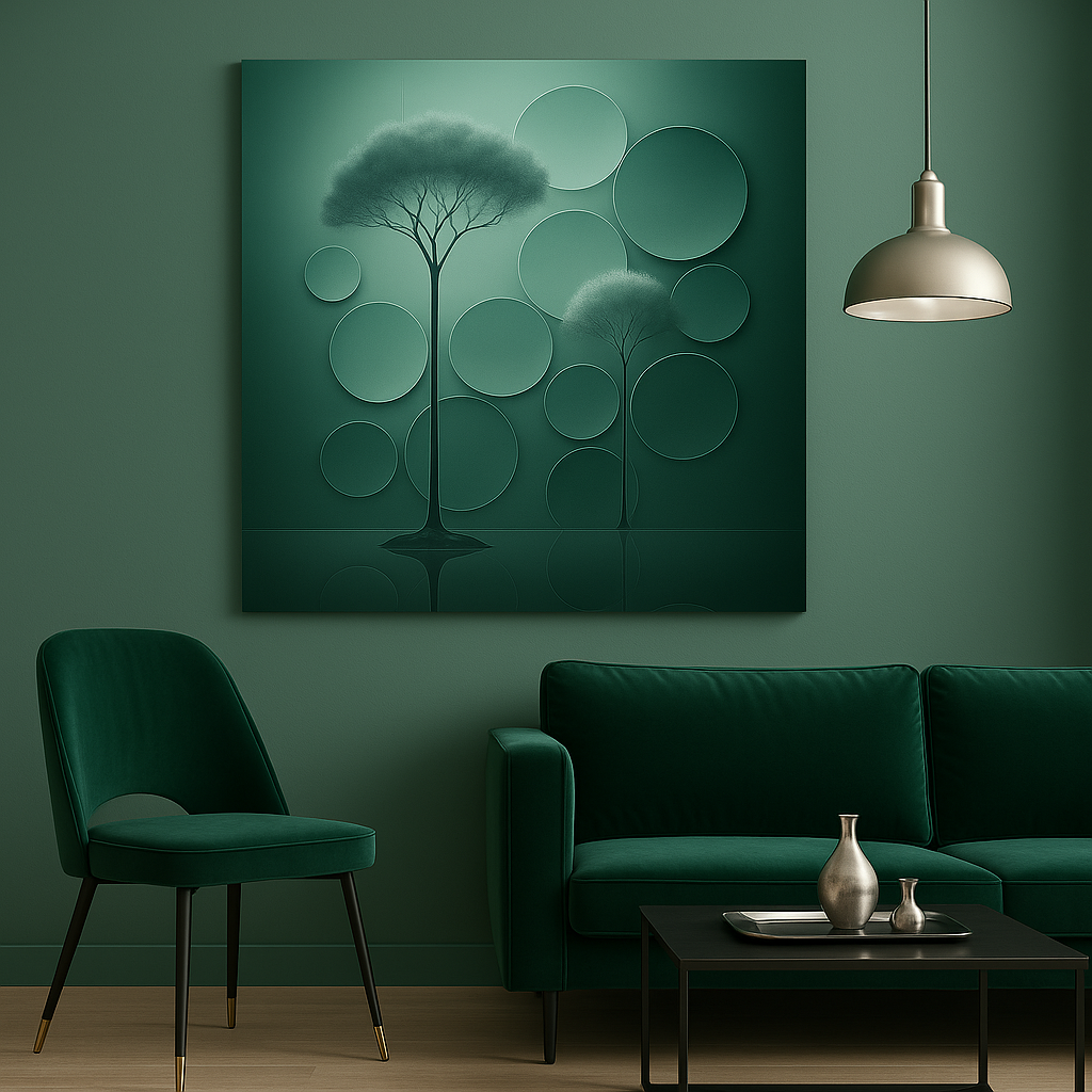 ,, Smaragdinė tyla'' – tai paveikslas, kuriame susilieja gamtos ramybė ir šiuolaikinė estetika. Gili smaragdinių atspalvių erdvė sukuria meditacinę nuotaiką, o minimalistiniai medžių siluetai kviečia akimirkai sustoti ir pajusti tylos grožį.