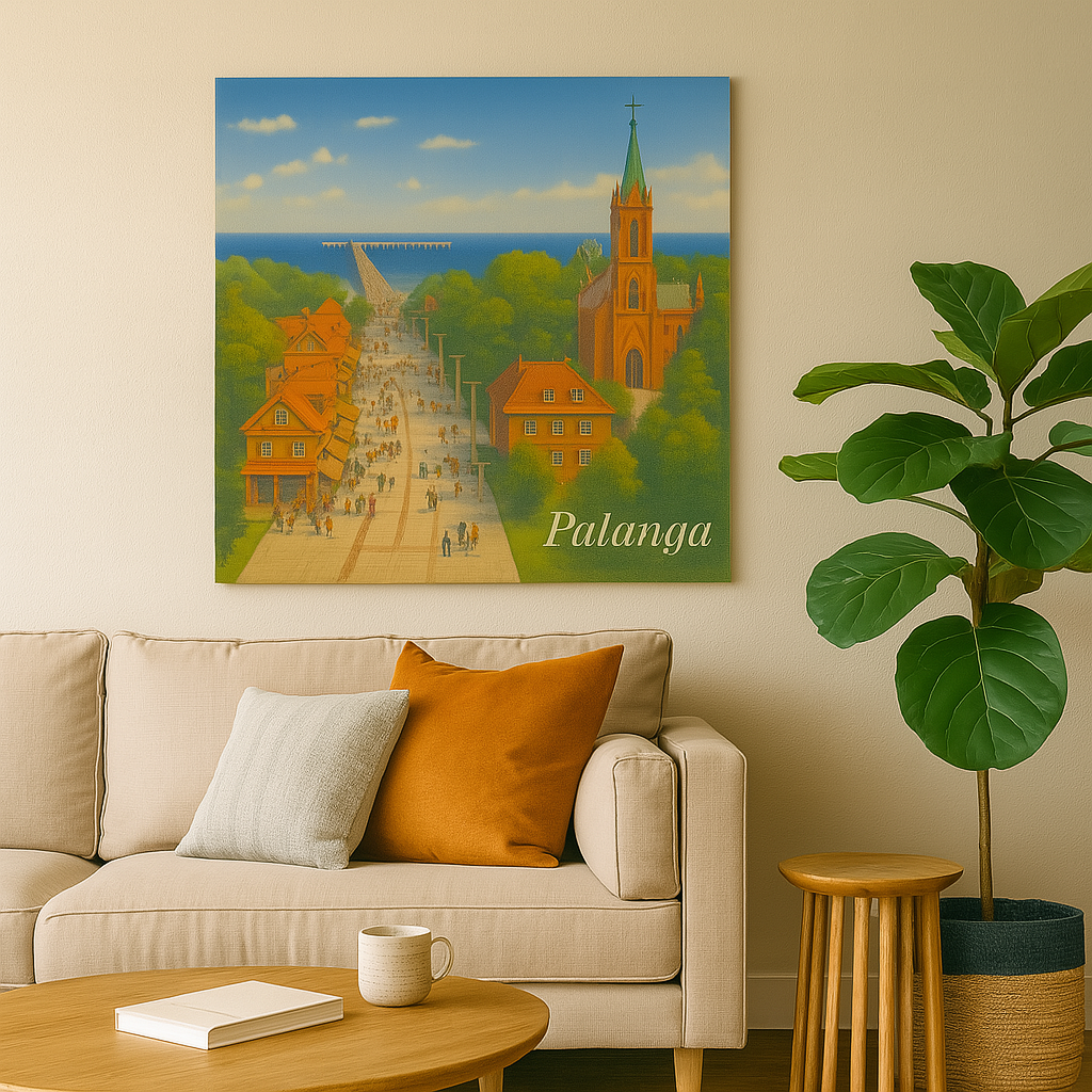 „Palanga“ – tai paveikslas, kuriame atsiskleidžia gyvybingas kurorto ritmas ir pajūrio ramybė. Vaizduojama Basanavičiaus gatvė veda žvilgsnį link Palangos tilto ir Baltijos jūros horizonto, o šone stovi iškilusi neogotikinė bažnyčia – miesto simbolis. Aplink šurmuliuoja poilsiautojai, tarp medžių žvilgčioja raudonstogiai namai. Šis kūrinys – tai vasaros šilumos, judesio ir atostogų nuotaikos įamžinimas drobėje. Puikiai tinka visiems, kuriems Palanga reiškia ne tik vietą, bet ir jausmą.
