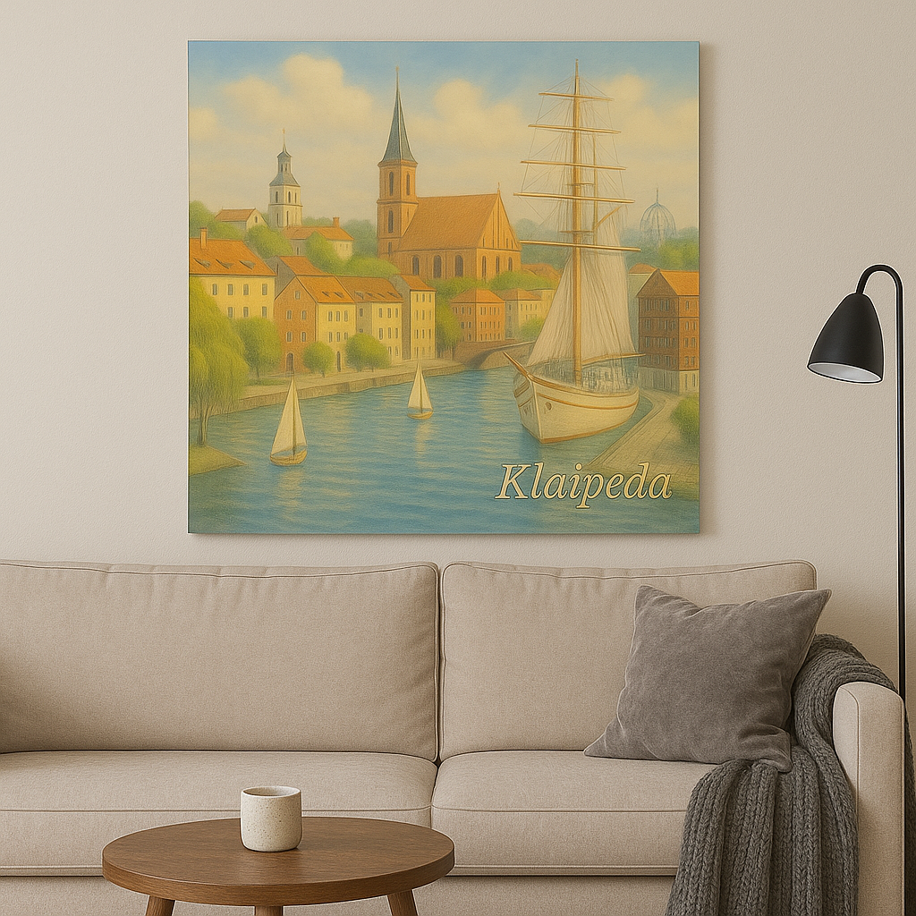 „Klaipėda“ – tai paveikslas, kuriame susilieja uosto miesto dvasia ir pajūrio ramybė. Jame vaizduojama senamiesčio architektūra, istoriniai raudonų plytų pastatai, burlaiviai ir baltos burės, plaukiančios ramiu vandeniu. Fone kyla bažnyčios bokštas, o krantinė alsuoja lėtu, bet gyvu miesto ritmu. Šis kūrinys – tai duoklė Klaipėdos istorijai, jūros artumui ir laisvės pojūčiui, kuriuo alsuoja unikalus Lietuvos uostamiestis.