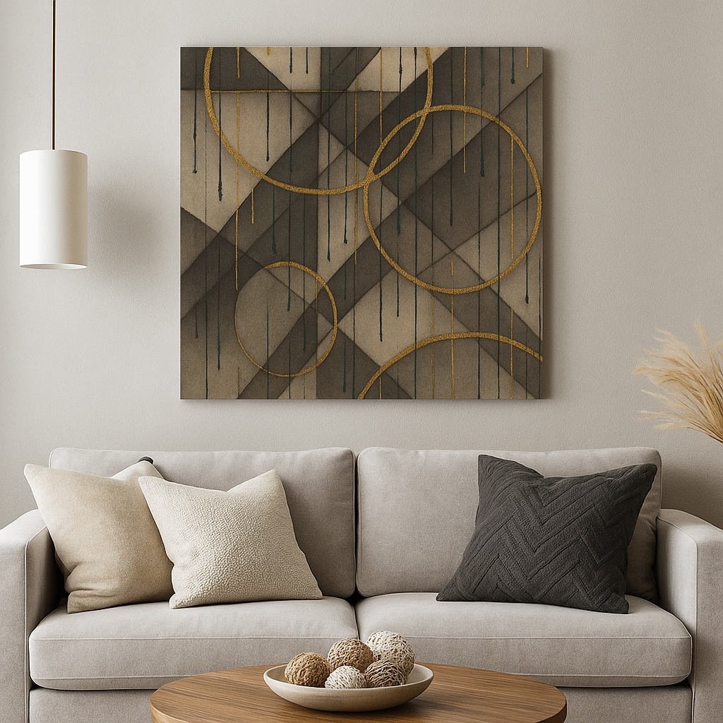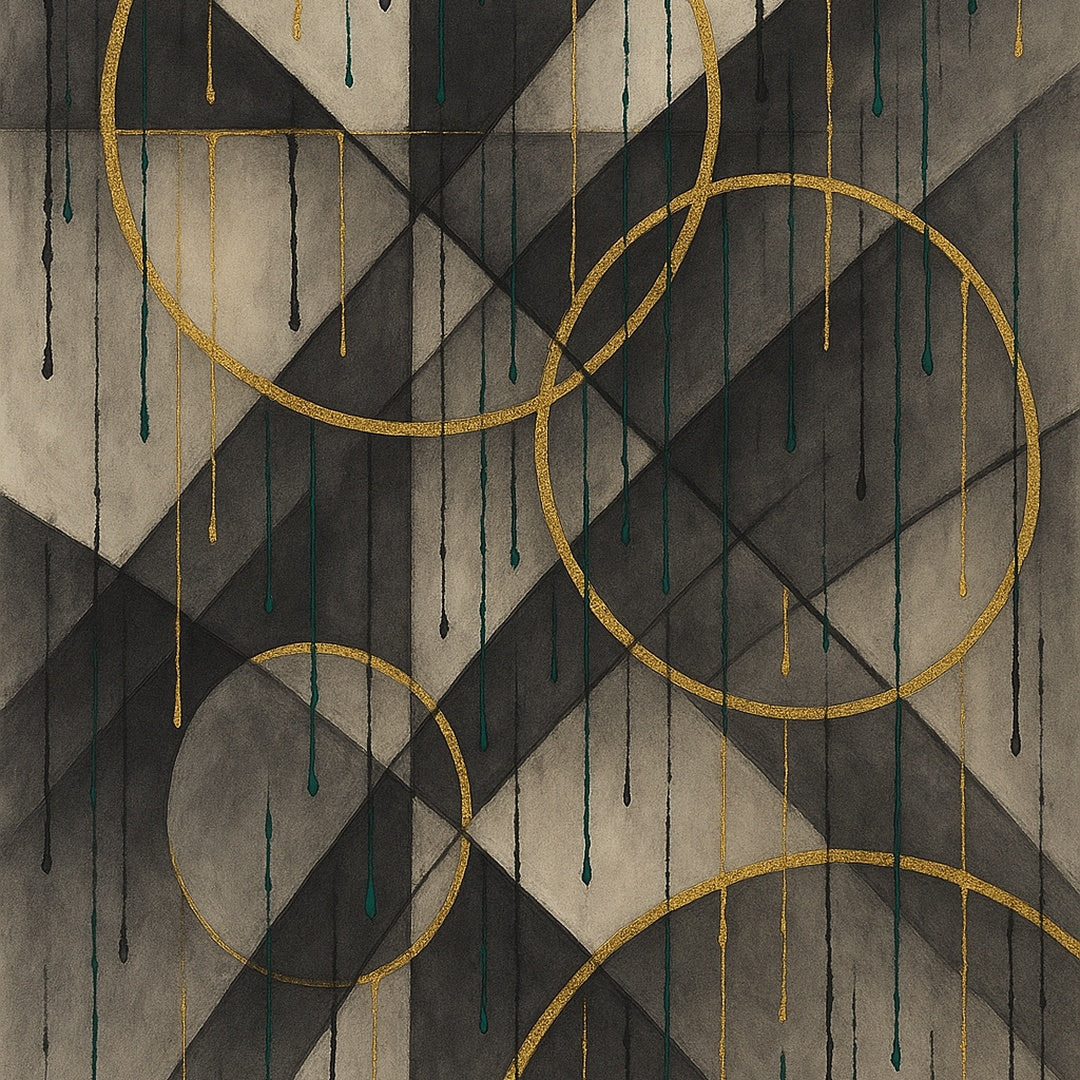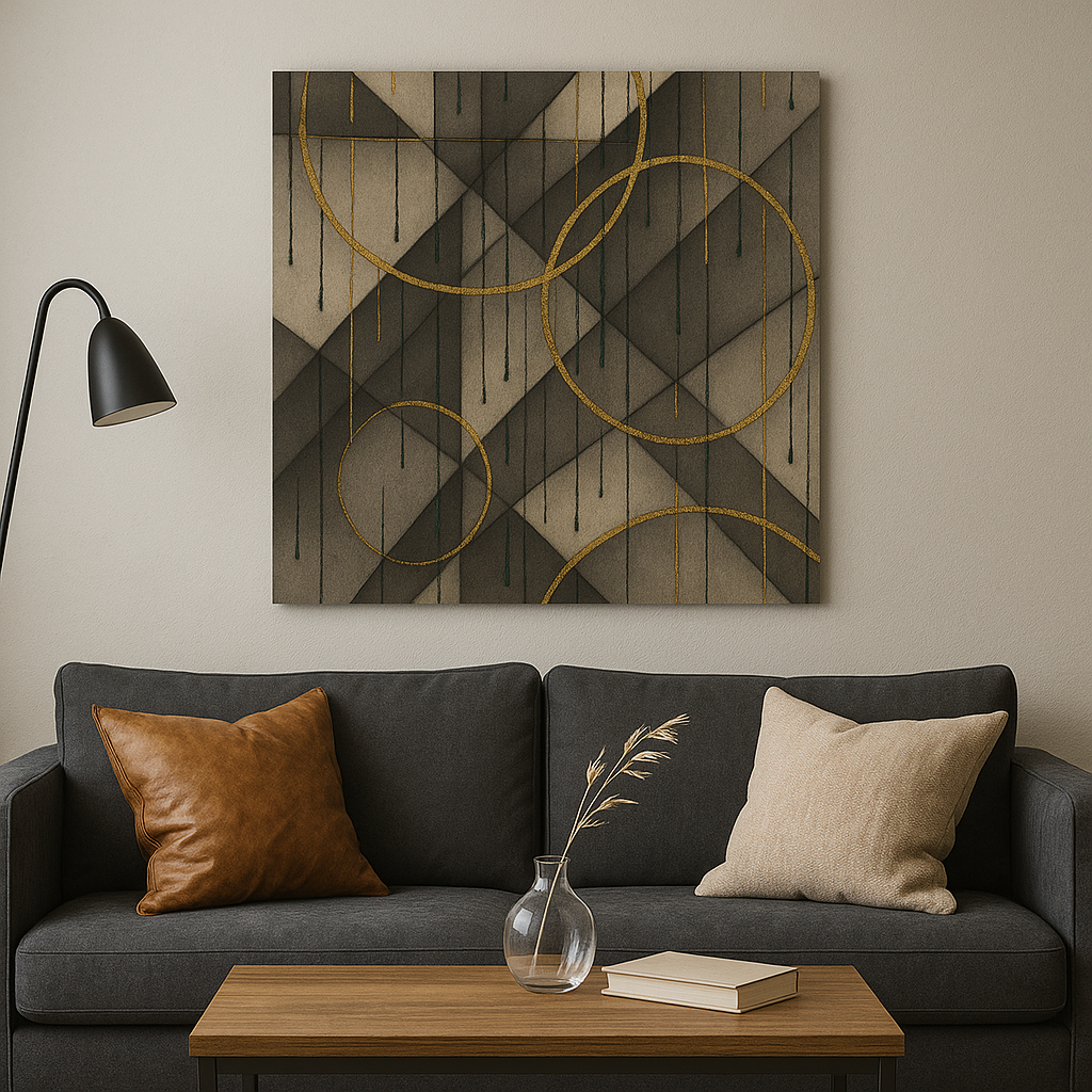 ,,Aukso ratuose'' – tai modernus paveikslas, kuriame susilieja geometrija, paslaptis ir prabanga. Tamsių tonų foną kerta auksiniai apskritimai, tarsi simbolizuojantys gyvenimo ciklas, laiko tėkmę ar trapias ribas tarp chaoso ir tvarkos. Lašeliai, slystantys žemyn, primena mintis ar jausmus, kurie nepastebimai lieka pėdsakus. Tai paveikslas, kuris kalba – tyliai, bet giliai.