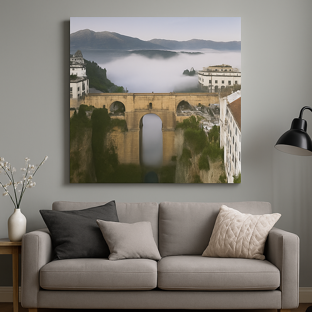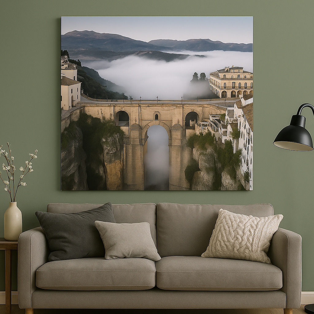 , ,Ronda tylos slėnyje'' – tai paveikslas, perteikiantis įspūdingą akimirką iš Andalūzijos širdies. Didysis Puente Nuevo tiltas jungia du Ronda miesto kraštus, dramatiškai iškilęs virš gilaus El Tajo tarpeklio, o tylūs baltieji pastatai glaudžiasi prie uolų krašto. Tarsi nutylėta istorija, šis vaizdas kviečia sustoti – grožėtis migla apgaubtais kalnais, stebėti tolumoje skendinčią ramybę ir pajusti senamiesčio alsavimą.