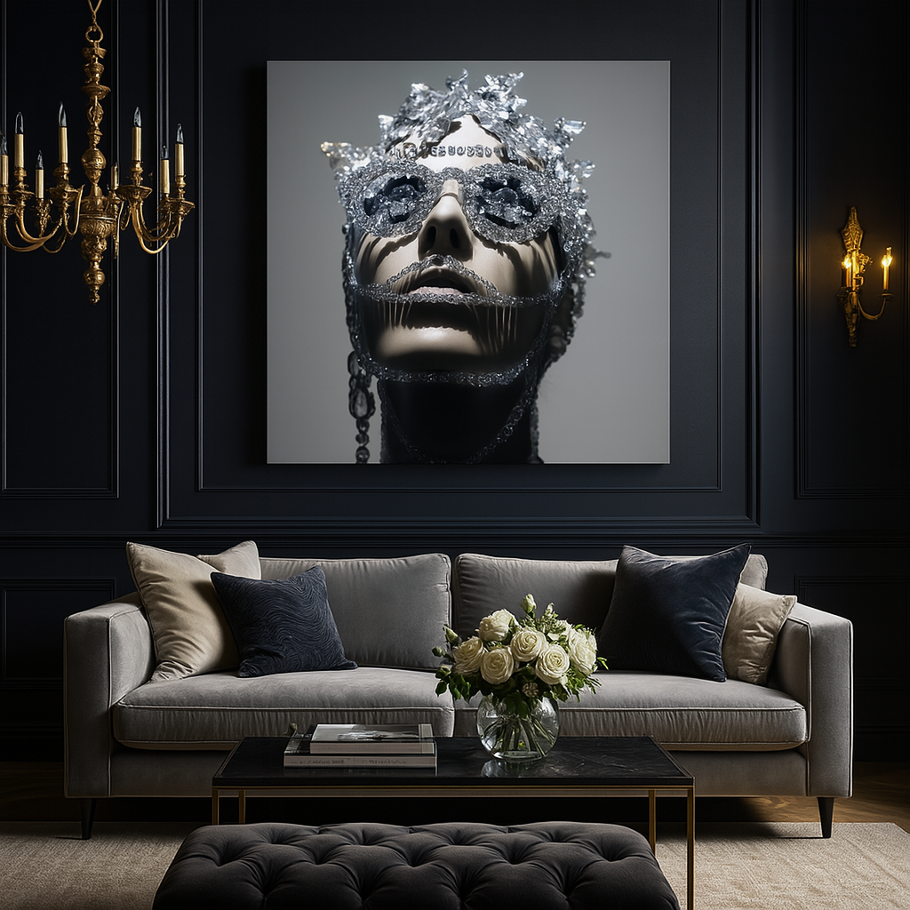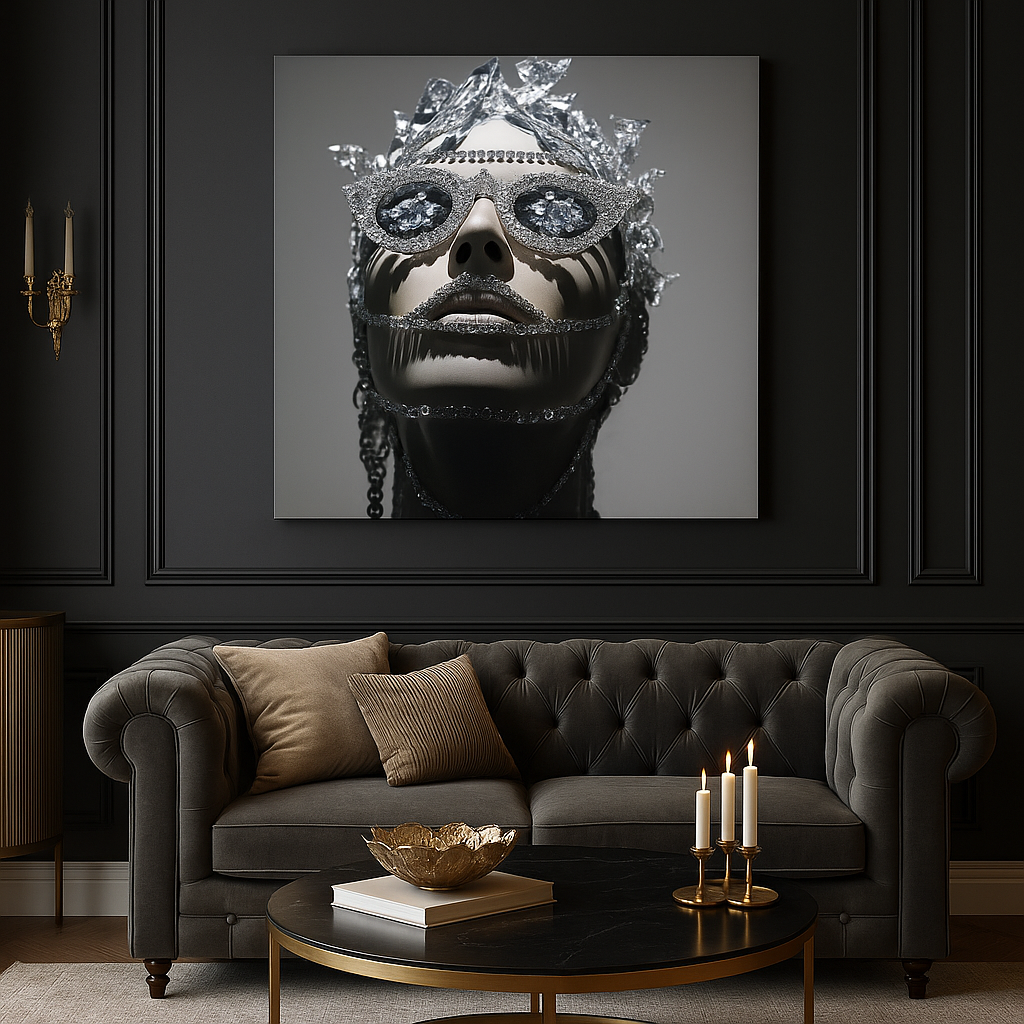 „Kristalų Karalienė“ – tai įspūdingas meno kūrinys, kuriame susilieja prabanga, ledinis žavesys ir futuristinė elegancija. Tarsi iš kitos realybės, ši moteris sukurta iš šviesos, deimantų ir tylos. Paveikslas traukia žvilgsnį ir nepalieka abejingų – tikra interjero pažiba.