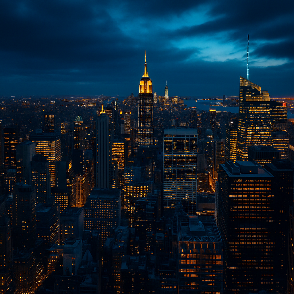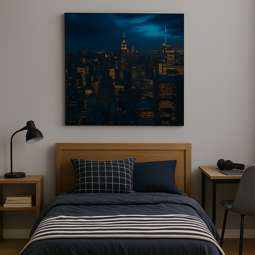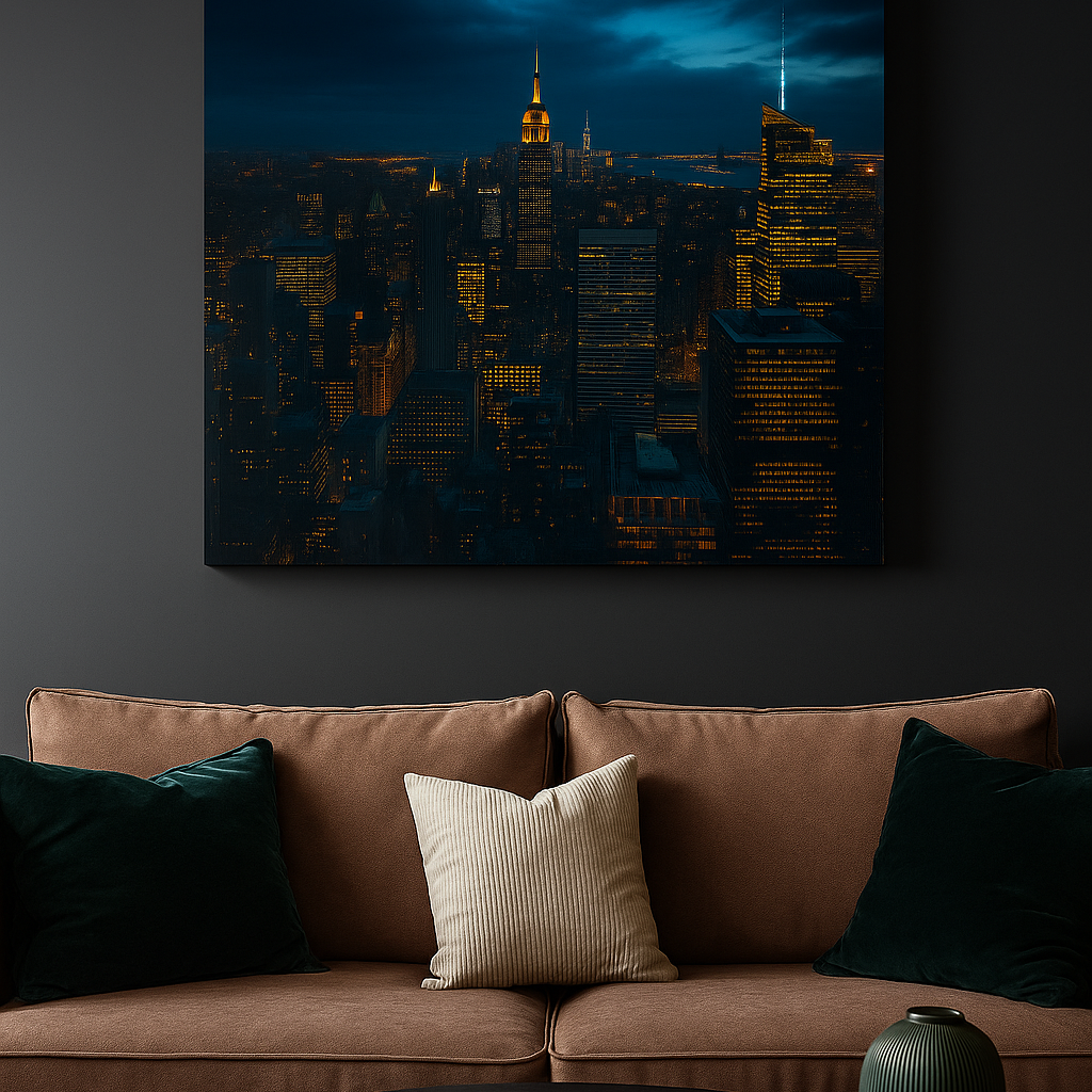 ,,Niujorko šviesos" – tai paveikslas, kuriame atsiskleidžia naktinio didmiesčio grožis ir paslaptis . Aukštai iškilę dangoraižiai skendi šviesų jūroje, o tyliai pulsuojantis miestas kviečia susimąstyti, svajoti ir pasiklysti tarp šviesų. Tai akimirka, kai miestas tampa ne tik vieta, bet jausmu.