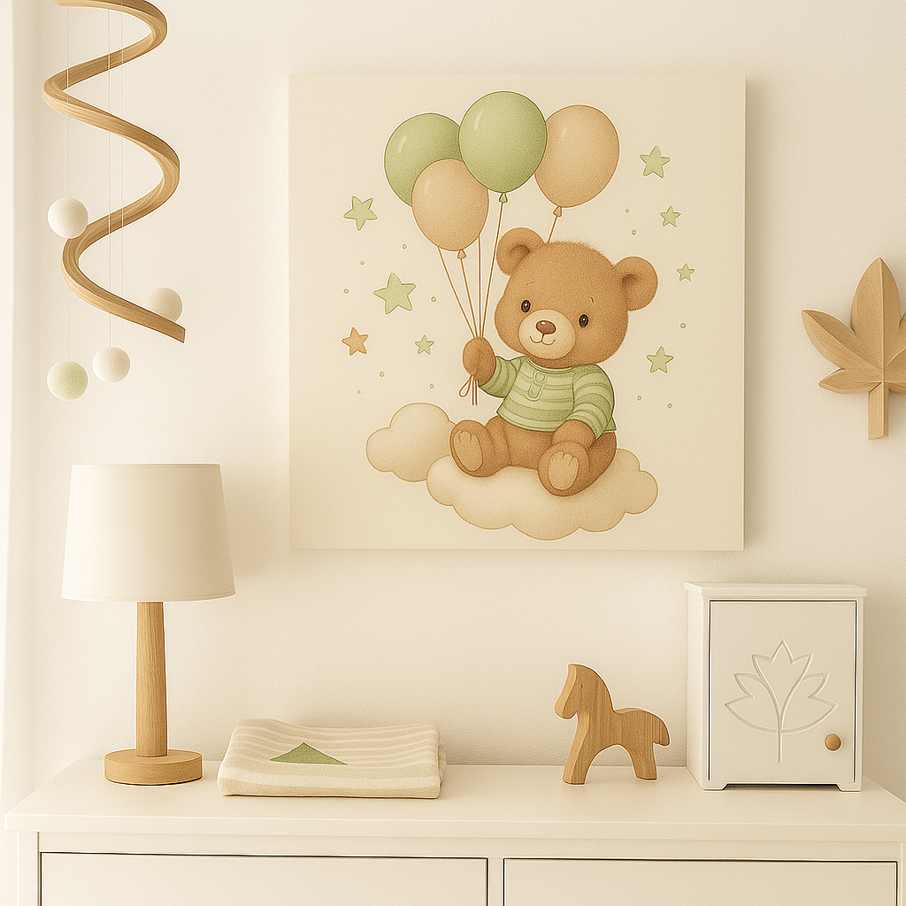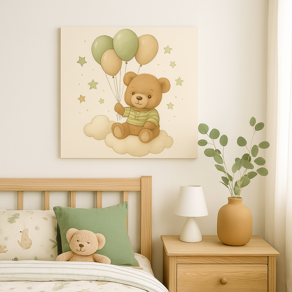 „Meškučio skrydis“ – tai paveikslas, kuriame meškutis su balionu lengvai kyla padebesiais. Švelnios spalvos ir žaisminga nuotaika kuria jaukų, vaikišką pasaulį – puikus akcentas mažųjų kambarių.