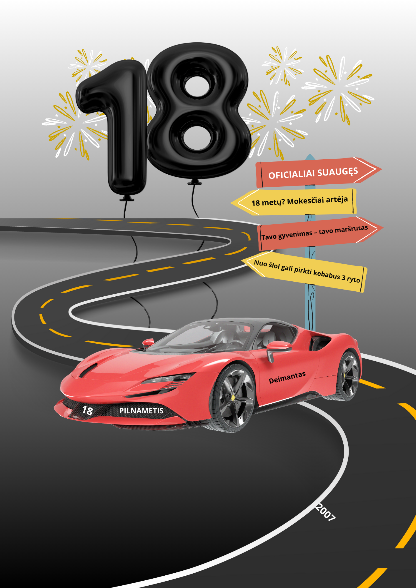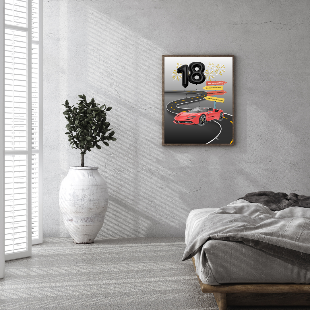 Pilnametystės greitkelis – plakatas 18-ojo gimtadienio proga! Simbolinis kelias, greitas automobilis ir spalvingi kelio ženklai – viskas, ko reikia, kad pažymėtų svarbią ribą: nuo dabar – vairuoji ne tik žinomas, bet ir savo gyvenimą!