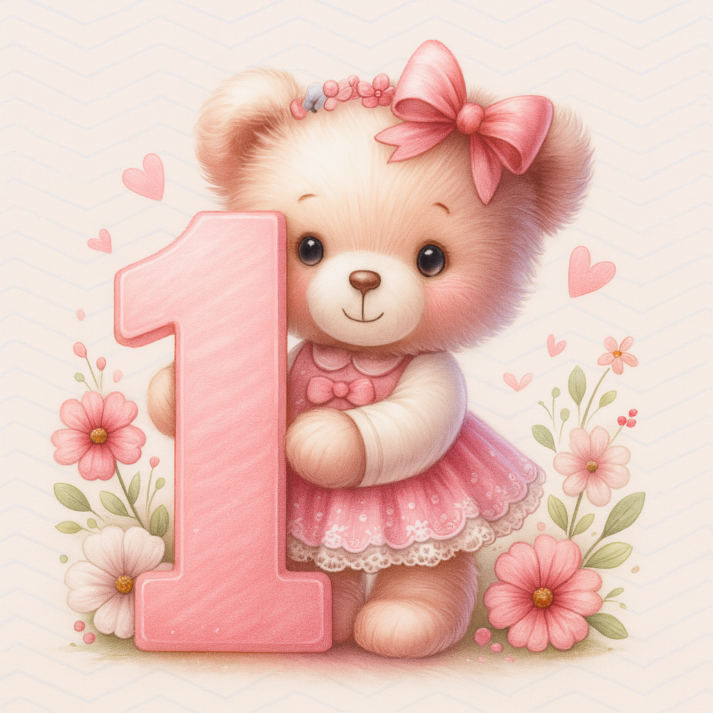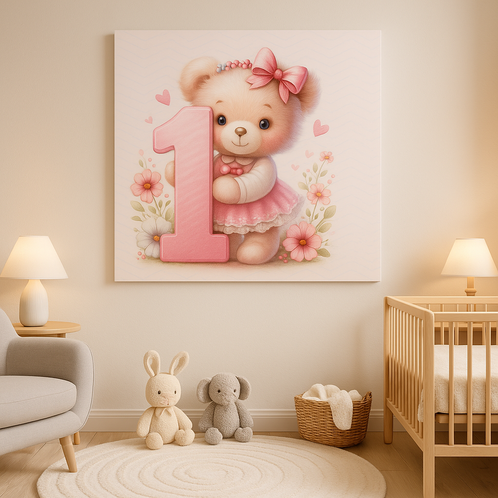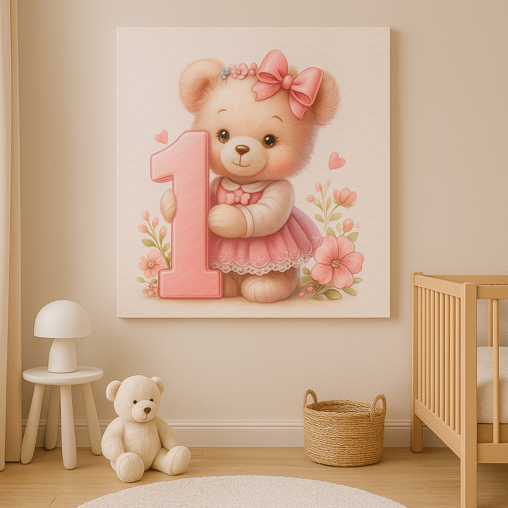 „Pirmasis gimtadienis“ – tai švelnus ir jaukus paveikslas, kuriame miela meškutė su rožine suknele apkabina simbolinį skaičių „1“. Pastelinės spalvos, gėlės ir širdelės kuria šiltą, saugią nuotaiką – puikus akcentas vaikų kambariui ar ypatingai pirmai dovanai .