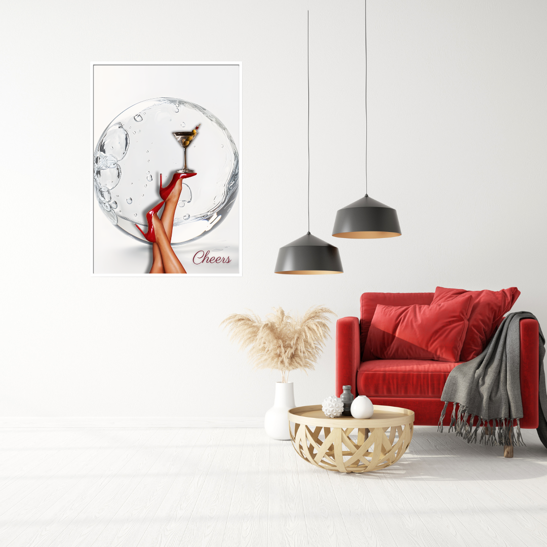 „Cheers“ – plakatas, kuris spinduliuoja eleganciją, moteriškumą ir šventinę nuotaiką. Raudoni aukštakulniai, taurė su alyvuogėmis ir stiklo burbulo fonas sukuria stilingą bei žaismingą atmosferą, kuri papuoš bet kokį interjerą.