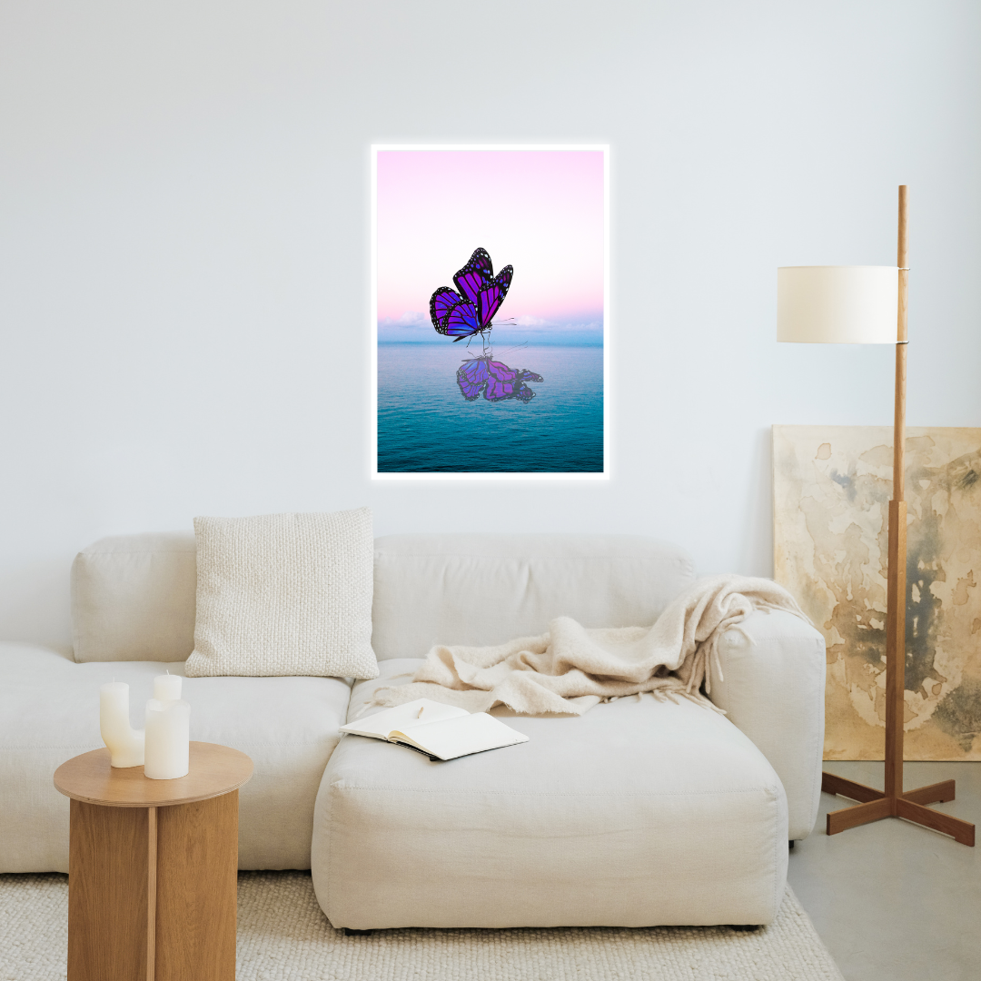 „Drugelio ramybė“ – plakatas, kuris spinduliuoja lengvumu, laisve ir subtiliu grožiu. Violetinis drugelis virš ramių vandens bangų tampa harmonijos ir atsinaujinimo simboliu. Švelnus rožinis dangus ir jūros atspindžiai sukuria jaukią, raminančią atmosferą, puikiai tinkančią moderniam interjerui.