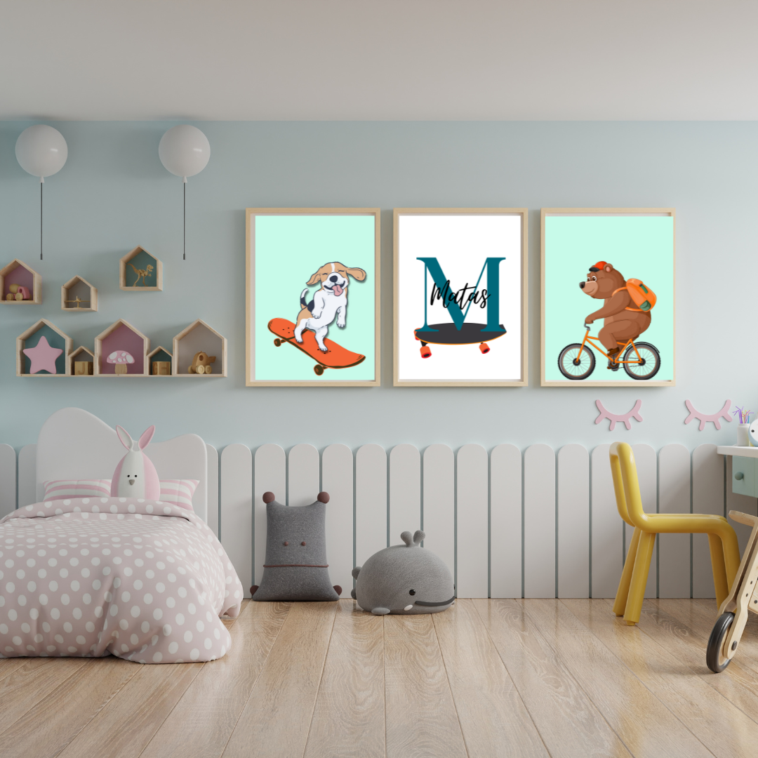 Skubu į nuotykį! – žaismingas trijų plakatų rinkinys, kupinas judesio, linksmybių ir vaikystės energijos. Riedlente riedantis šuniukas, dviratį minantis meškinas ir personalizuota raidė – viskas, ko reikia, kad vaiko kambarys spinduliuotų gerą nuotaiką ir įkvėptų naujienų nuotykiams!