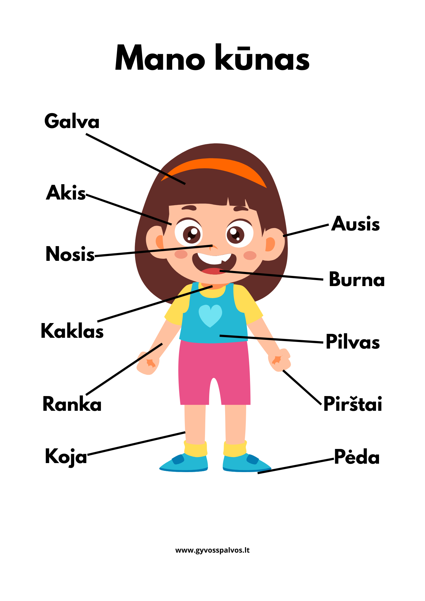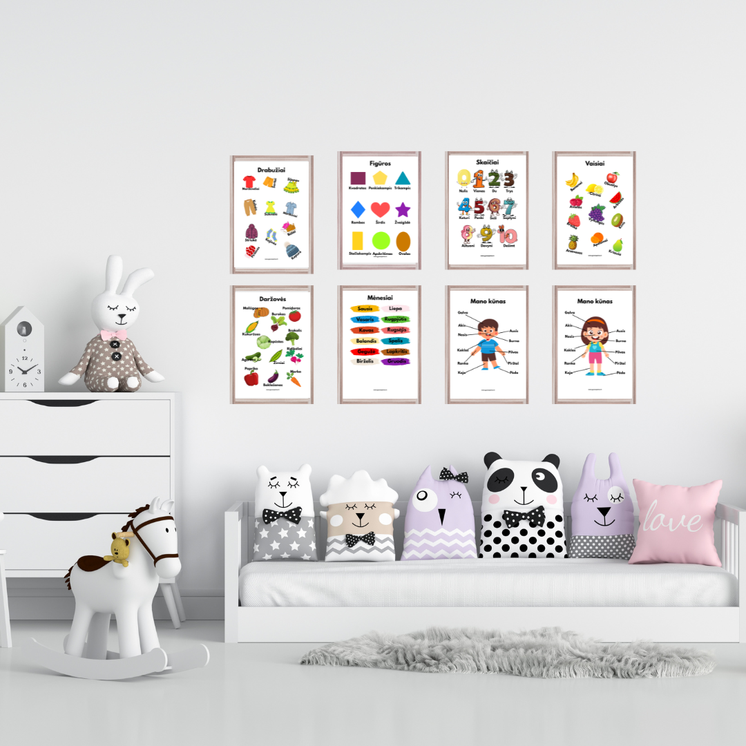 📚 8 A4 formato plakatai: figūros, skaičiai, vaisiai, daržovės, drabužiai, mėnesiai ir žmogaus kūno dalys.